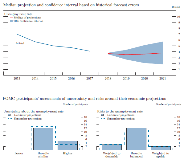 Participants' assessments of the level of uncertainty surrounding their individual economic projections are shown in the bottom-left panels of figures 4.A, 4.B, and 4.C. Participants generally continued to view the degree of uncertainty attached to their economic projections for real GDP growth and inflation as broadly similar to the average of the past 20 years.3 A couple more participants than in September viewed the uncertainty around the unemployment rate as higher than average.