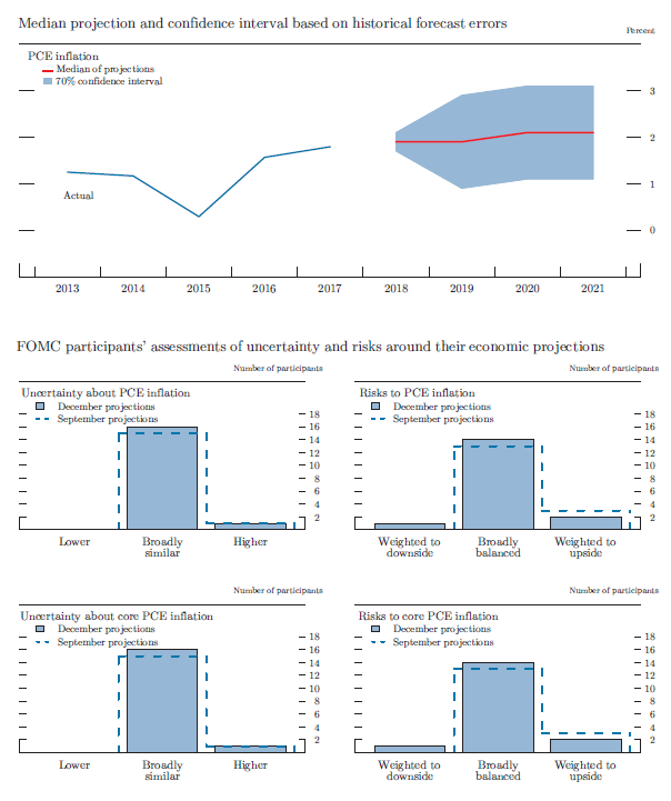 The median of projections for total PCE price inflation was 1.9 percent in 2019, a bit lower than in the September SEP, while the medians for 2020 and 2021 were 2.1 percent, the same as in the previous projections. The medians of projections for core PCE price inflation over the 2019-21 period were 2.0 percent, a touch lower than in September. Some participants pointed to softer incoming data or recent declines in oil prices as reasons for shaving their projections for inflation.