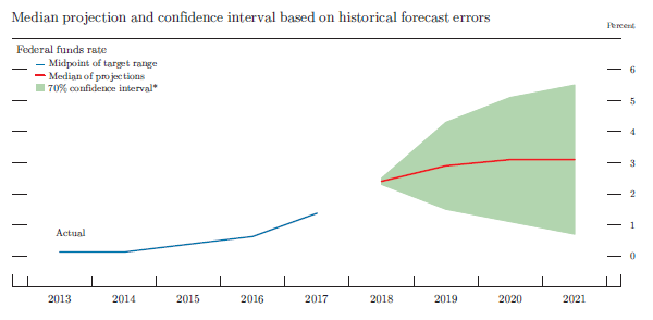 *Note: The blue and red lines are based on actual values and median projected values, respectively, of the Com- mittee’s target for the federal funds rate at the end of the year indicated. The actual values are the midpoint of the target range; the median projected values are based on either the midpoint of the target range or the target level. The confidence interval around the median projected values is based on root mean squared errors of various private and government forecasts made over the previous 20 years. The confidence interval is not strictly consistent with the projections for the federal funds rate, primarily because these projections are not forecasts of the likeliest outcomes for the federal funds rate, but rather projections of participants' individual assessments of appropriate monetary policy. Still, historical forecast errors provide a broad sense of the uncertainty around the future path of the federal funds rate generated by the uncertainty about the macroeconomic variables as well as additional adjustments to monetary policy that may be appropriate to offset the effects of shocks to the economy.