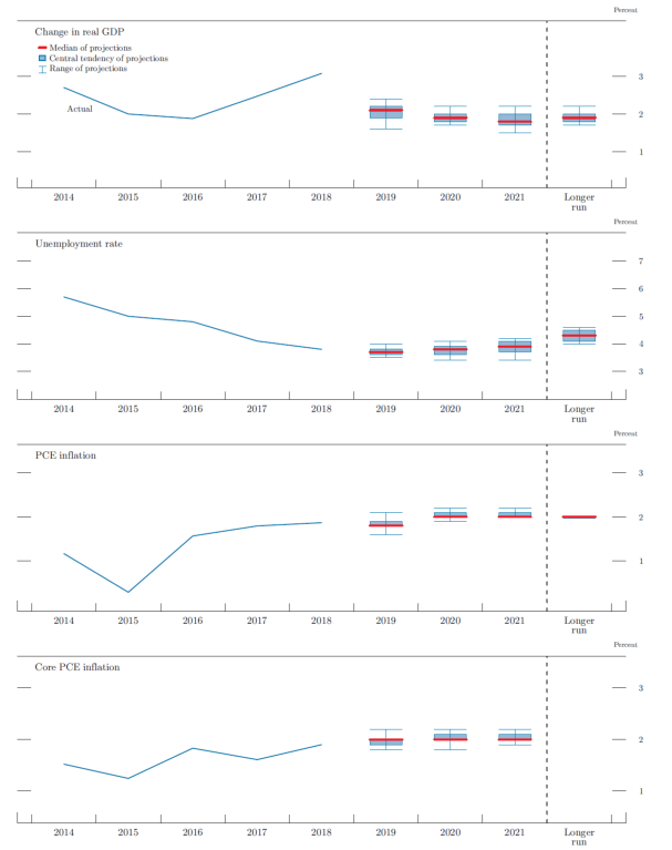 Note: Projections of change in real gross domestic product (GDP) and projections for both measures of inflation are percent changes from the fourth quarter of the previous year to the fourth quarter of the year indicated. PCE inflation and core PCE inflation are the percentage rates of change in, respectively, the price index for personal consumption expenditures (PCE) and the price index for PCE excluding food and energy. Projections for the unemployment rate are for the average civilian unemployment rate in the fourth quarter of the year indicated. Each participant's projections are based on his or her assessment of appropriate monetary policy. Longer-run projections represent each participant's assessment of the rate to which each variable would be expected to converge under appropriate monetary policy and in the absence of further shocks to the economy. The projections for the federal funds rate are the value of the midpoint of the projected appropriate target range for the federal funds rate or the projected appropriate target level for the federal funds rate at the end of the specified calendar year or over the longer run. The December projections were made in conjunction with the meeting of the Federal Open Market Committee on December 18-19, 2018. One participant did not submit longer-run projections for the change in real GDP, the unemployment rate, or the federal funds rate in conjunction with the December 18-19, 2018, meeting, and one participant did not submit such projections in conjunction with the March 19-20, 2019, meeting.