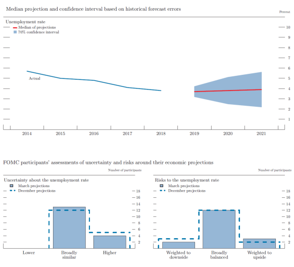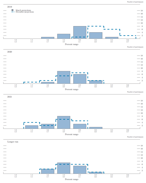 In conjunction with the Federal Open Market Committee (FOMC) meeting held on March 19-20, 2019, meeting participants submitted their projections of the most likely outcomes for real gross domestic product (GDP) growth, the unemployment rate, and inflation for each year from 2019 to 2021 and over the longer run. Each participant's projections were based on information available at the time of the meeting, together with his or her assessment of appropriate monetary policy--including a path for the federal funds rate and its longer-run value--and assumptions about other factors likely to affect economic outcomes. The longer-run projections represent each participant's assessment of the value to which each variable would be expected to converge, over time, under appropriate monetary policy and in the absence of further shocks to the economy.1 "Appropriate monetary policy" is defined as the future path of policy that each participant deems most likely to foster outcomes for economic activity and inflation that best satisfy his or her individual interpretation of the statutory mandate to promote maximum employment and price stability.