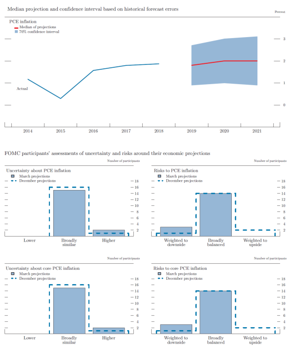 As shown in table 1, the medians of projections for total PCE price inflation were 1.8 percent in 2019 and 2.0 percent in both 2020 and 2021, each a touch lower than in the December SEP. The medians of projections for core PCE price inflation over the 2019-21 period were 2.0 percent, the same as in December.