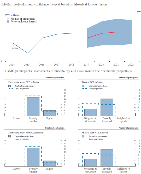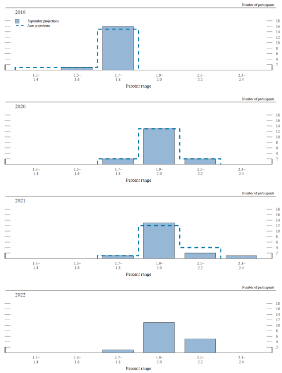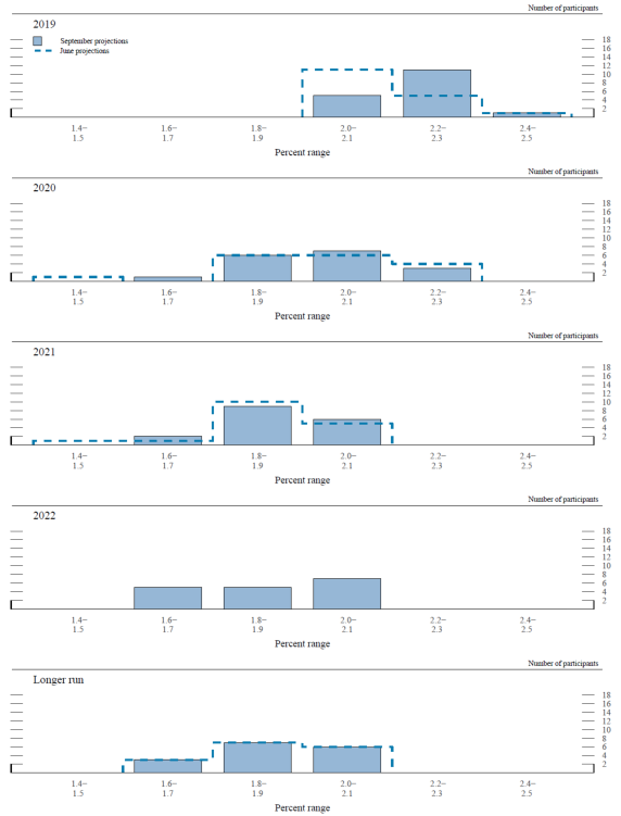 As shown in table 1, the median of projections for total PCE price inflation was 1.5 percent in 2019, 1.9 percent in 2020, and 2.0 percent in 2021; these medians were unchanged from June. For 2022, the median projection for total PCE was 2.0 percent. The medians of projections for core PCE price inflation were 1.8 percent for 2019 and 1.9 percent for 2020. The median projections for core inflation for 2021 and 2022 were 2.0 percent. These medians were also unchanged from June for each year included in the June SEP.