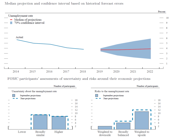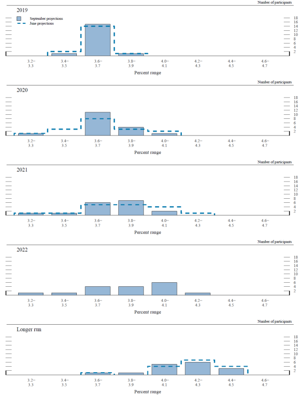 The median of projections for the unemployment rate in the fourth quarter of 2019 was 3.7 percent, 1/2 percentage point below the median assessment of its longer-run level of 4.2 percent. The medians of projections for 2020, 2021, and 2022 were 3.7 percent, 3.8 percent, and 3.9 percent, respectively. The median projected unemployment rate for 2019 was slightly higher than in the June SEP, while the median projected unemployment rates for 2020 and 2021 were unchanged relative to the June SEP. A vast majority of participants who submitted longer-run projections expected that the unemployment rate in 2022 would be below their estimates of its longer-run level, with some participants projecting a gap of 1/2 percentage point or more.