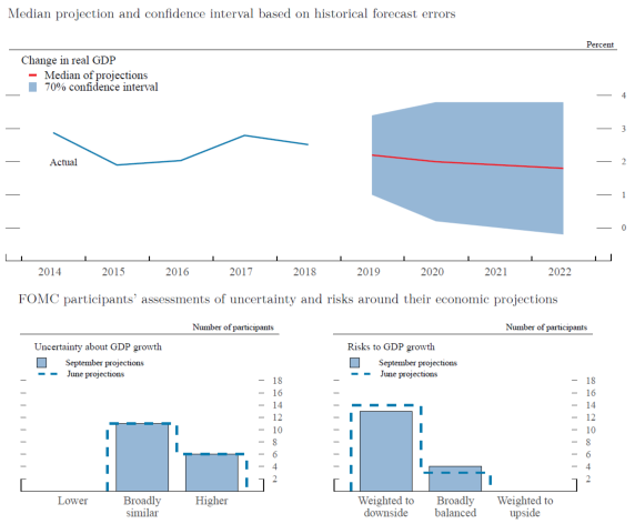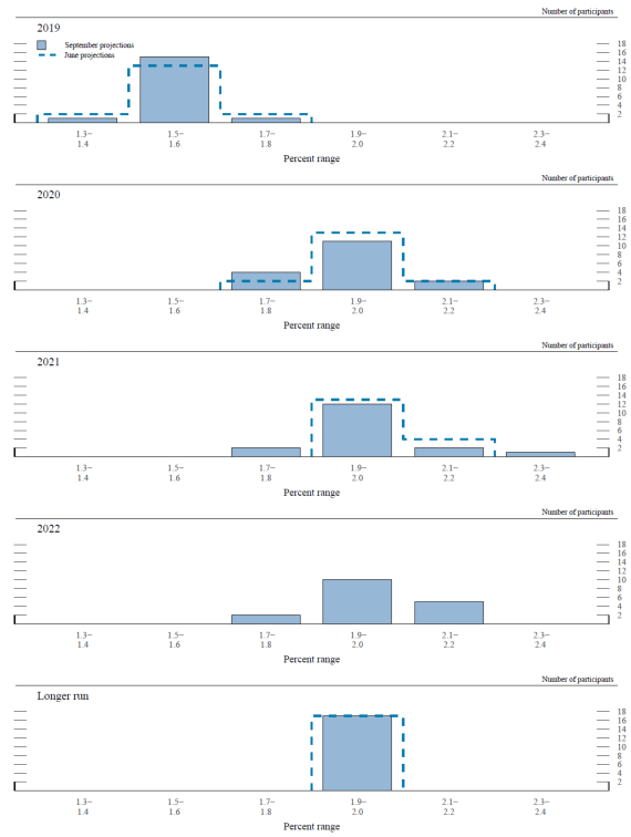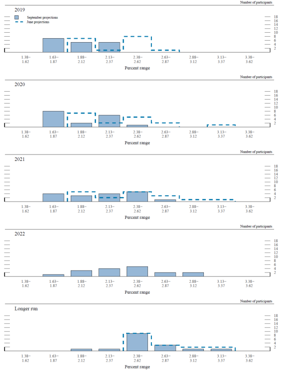 In conjunction with the Federal Open Market Committee (FOMC) meeting held on September 17–18, 2019, meeting participants submitted their projections of the most likely outcomes for real gross domestic product (GDP) growth, the unemployment rate, and inflation for each year from 2019 to 2022 and over the longer run. Each participant's projections were based on information available at the time of the meeting, together with his or her assessment of appropriate monetary policy—including a path for the federal funds rate and its longer-run value—and assumptions about other factors likely to affect economic outcomes. The longer-run projections represent each participant's assessment of the value to which each variable would be expected to converge, over time, under appropriate monetary policy and in the absence of further shocks to the economy.1 "Appropriate monetary policy" is defined as the future path of policy that each participant deems most likely to foster outcomes for economic activity and inflation that best satisfy his or her individual interpretation of the statutory mandate to promote maximum employment and price stability.