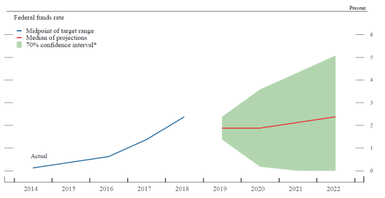 3. The confidence interval for the federal funds rate is assumed to be symmetric except when it is truncated at zero, which is the bottom of the lowest target range for the federal funds rate that has been adopted in the past by the Committee. Return to text