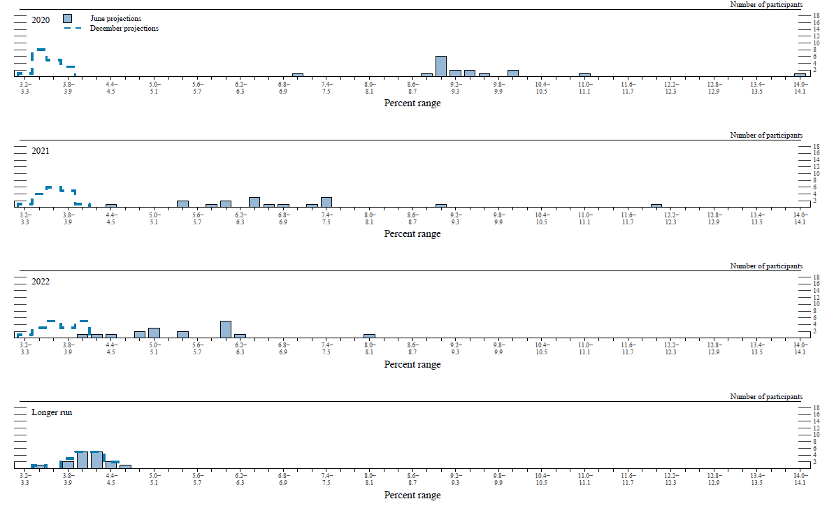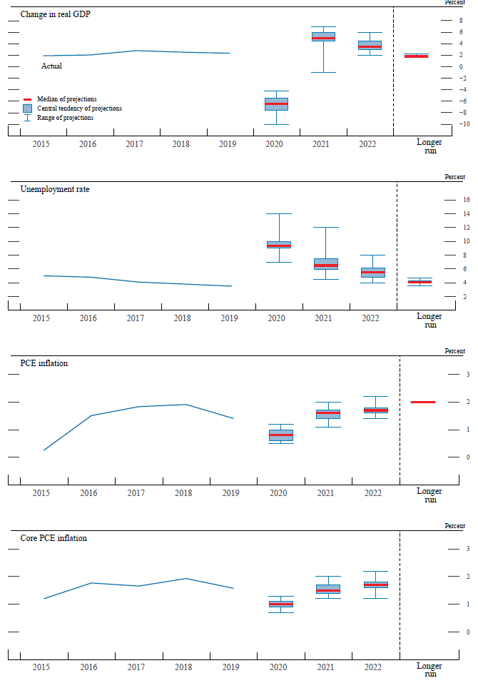 In conjunction with the Federal Open Market Committee (FOMC) meeting held on June 9–10, 2020, meeting participants submitted their projections of the most likely outcomes for real gross domestic product (GDP) growth, the unemployment rate, and inflation for each year from 2020 to 2022 and over the longer run. Each participant's projections were based on information available at the time of the meeting, together with his or her assessment of appropriate monetary policy—including a path for the federal funds rate and its longer-run value—and assumptions about other factors likely to affect economic outcomes. The longer-run projections represent each participant's assessment of the value to which each variable would be expected to converge, over time, under appropriate monetary policy and in the absence of further shocks to the economy.1 "Appropriate monetary policy" is defined as the future path of policy that each participant deems most likely to foster outcomes for economic activity and inflation that best satisfy his or her individual interpretation of the statutory mandate to promote maximum employment and price stability.