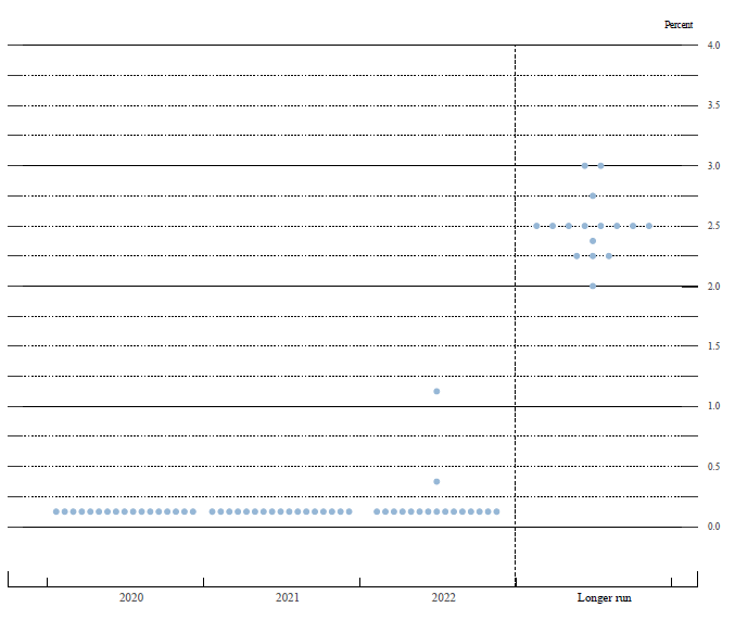 As shown in figure 2, almost all participants indicated that their expectations regarding the evolution of the economy, relative to the Committee's objectives of maximum employment and 2 percent inflation, would likely warrant keeping the federal funds rate at its current level through at least the end of 2022. The median of participants' assessments of the longer-run level for the federal funds rate was unchanged from its value in the December SEP.