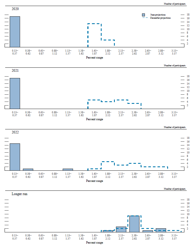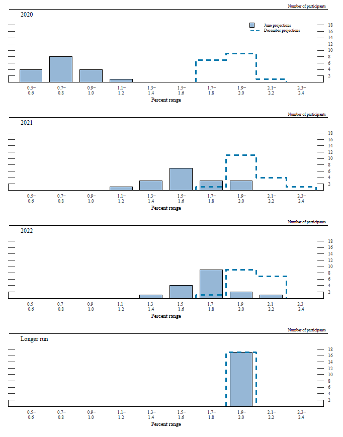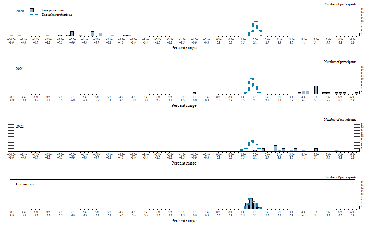 Note: Projections of change in real gross domestic product (GDP) and projections for both measures of inflation are percent changes from the fourth quarter of the previous year to the fourth quarter of the year indicated. PCE inflation and core PCE inflation are the percentage rates of change in, respectively, the price index for personal consumption expenditures (PCE) and the price index for PCE excluding food and energy. Projections for the unemployment rate are for the average civilian unemployment rate in the fourth quarter of the year indicated. Each participant's projections are based on his or her assessment of appropriate monetary policy. Longer-run projections represent each participant's assessment of the rate to which each variable would be expected to converge under appropriate monetary policy and in the absence of further shocks to the economy. The projections for the federal funds rate are the value of the midpoint of the projected appropriate target range for the federal funds rate or the projected appropriate target level for the federal funds rate at the end of the specified calendar year or over the longer run. The December projections were made in conjunction with the meeting of the Federal Open Market Committee on December 10–11, 2019. One participant did not submit longer-run projections for the change in real GDP, the unemployment rate, or the federal funds rate in conjunction with the December 10–11, 2019, meeting, and one participant did not submit such projections in conjunction with the June 9-10, 2020, meeting. No projections were submitted in conjunction with the March 2020 FOMC meeting.
