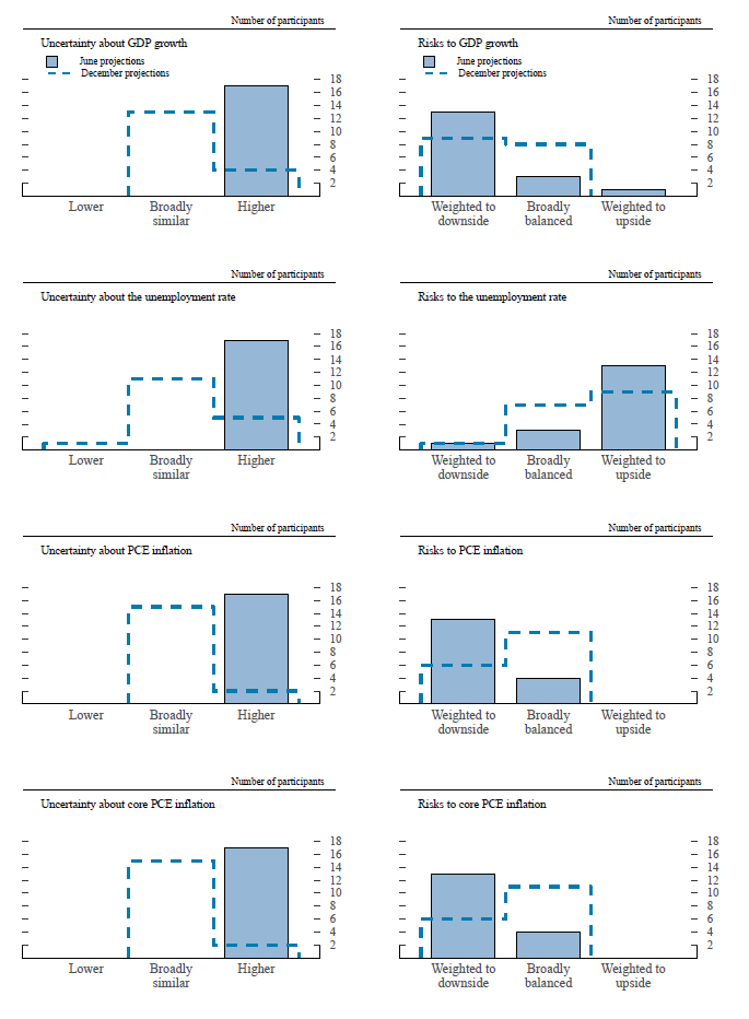 Amid uncertainty about the course of the pandemic and its effects on the economy, all participants regarded the uncertainties around their projections as higher than the average over the past 20 years. In addition, a substantial majority of participants assessed the risks to their outlook for real GDP growth as weighted to the downside and the risks to their unemployment rate projections as weighted to the upside. The risks to inflation projections were judged as weighted to the downside by a substantial majority of participants; no participant assessed the risks to his or her inflation outlook as weighted to the upside.