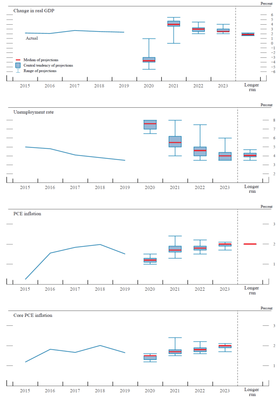 Note: Projections of change in real gross domestic product (GDP) and projections for both measures of inflation are percent changes from the fourth quarter of the previous year to the fourth quarter of the year indicated. PCE inflation and core PCE inflation are the percentage rates of change in, respectively, the price index for personal consumption expenditures (PCE) and the price index for PCE excluding food and energy. Projections for the unemployment rate are for the average civilian unemployment rate in the fourth quarter of the year indicated. Each participant's projections are based on his or her assessment of appropriate monetary policy. Longer-run projections represent each participant's assessment of the rate to which each variable would be expected to converge under appropriate monetary policy and in the absence of further shocks to the economy. The projections for the federal funds rate are the value of the midpoint of the projected appropriate target range for the federal funds rate or the projected appropriate target level for the federal funds rate at the end of the specified calendar year or over the longer run. The June projections were made in conjunction with the meeting of the Federal Open Market Committee on June 9–10, 2020. One participant did not submit longer-run projections for the change in real GDP, the unemployment rate, or the federal funds rate in conjunction with the June 9–10, 2020, meeting, and one participant did not submit such projections in conjunction with the September 15–16, 2020, meeting.