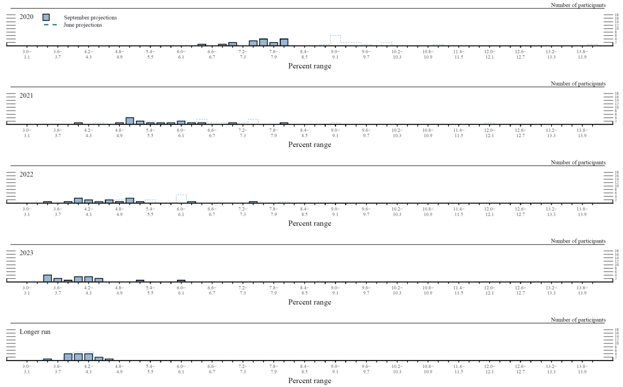 The distribution of estimates for the longer-run unemployment rate was unchanged from the June SEP. Many participants indicated that they were still assessing whether the sharp contraction in economic activity during the first half of this year was likely to leave a lasting imprint on the labor market or the productive capacity of the economy.