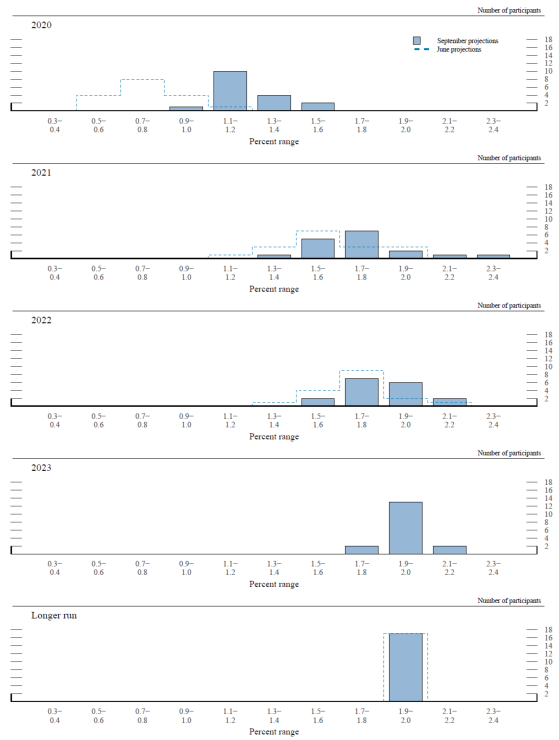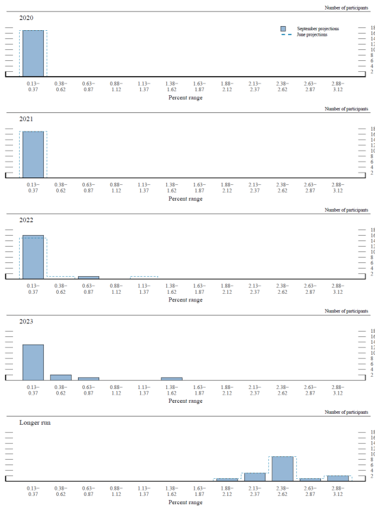 As shown in figure 2, most participants indicated that their expectations regarding the evolution of the economy, relative to the Committee's maximum- employment and price-stability objectives, would likely warrant keeping the federal funds rate at its current level through at least the end of 2023. The median of participants' assessments of the longer-run level for the federal funds rate was unchanged from its value in the June SEP.