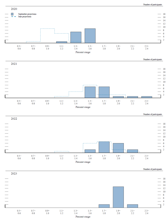 In conjunction with the Federal Open Market Committee (FOMC) meeting held on September 15–16, 2020, meeting participants submitted their projections of the most likely outcomes for real gross domestic product (GDP) growth, the unemployment rate, and inflation for each year from 2020 to 2023 and over the longer run. Each participant's projections were based on information available at the time of the meeting, together with her or his assessment of appropriate monetary policy—including a path for the federal funds rate and its longer-run value—and assumptions about other factors likely to affect economic outcomes. The longer-run projections represent each participant's assessment of the value to which each variable would be expected to converge, over time, under appropriate monetary policy and in the absence of further shocks to the economy.1 "Appropriate monetary policy" is defined as the future path of policy that each participant deems most likely to foster outcomes for economic activity and inflation that best satisfy his or her individual interpretation of the statutory mandate to promote maximum employment and price stability.