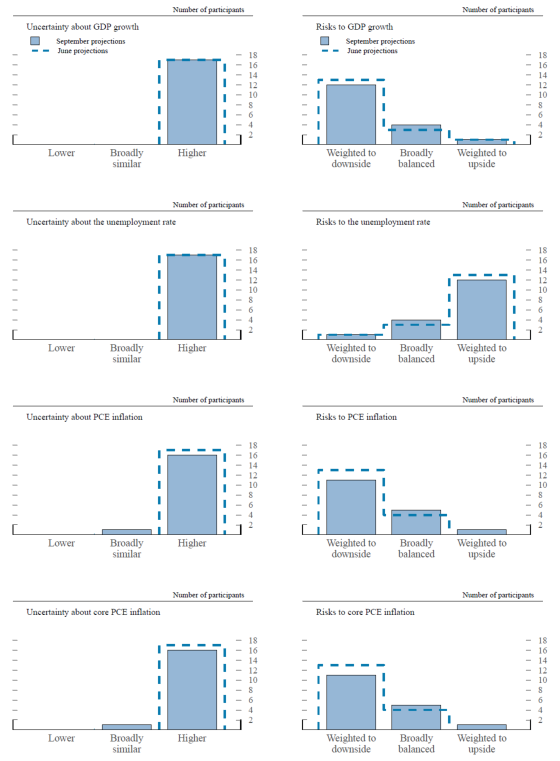 Amid uncertainty about the course of the pandemic and its effects on the economy, all participants continued to regard the uncertainties surrounding the economic outlook as higher than the average over the past 20 years. In addition, a substantial majority of participants assessed the risks to their outlook for real GDP growth as weighted to the downside and the risks to their unemployment rate projections as weighted to the upside. The risks to inflation projections were judged as weighted to the downside by a substantial majority of participants.