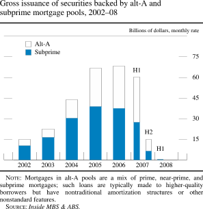 This market turbulence continued into early 2008, as liquidity in many financial markets continued to be impaired and risk spreads remained wide. After declining sharply late last year, issuance of non-agency-sponsored mortgage-backed securities essentially came to a halt by the beginning of 2008, and secondary-market trades of these assets were rare. Price indexes of non-agency-sponsored subprime MBS based on derivatives markets declined further. However, the unusual pressures that had been apparent in short-term investment-grade funding markets in December eased considerably in January, owing to a combination of the passing of year-end balance sheet concerns and the provision of additional liquidity by the Federal Reserve and foreign central banks.