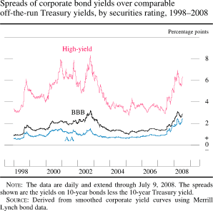 In longer-term financial markets, pressures generally eased in April and May. Spreads of conforming mortgage rates and corporate bond yields over yields on comparable-maturity Treasury securities narrowed, and prices and liquidity in the secondary market for leveraged loans increased. However, yield spreads for corporate bonds and mortgages moved higher in June. Equity prices of financial intermediaries, including the housing-related GSEs, Fannie Mae and Freddie Mac, dropped sharply in June and early July as concerns mounted both about their losses and longer-term profitability and about the prospects for earnings dilution given the considerable new capital that may need to be raised. Overall, indicators of financial market strains remain elevated compared with their levels in previous years.