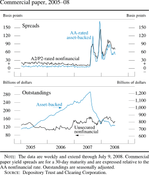 On balance, the composition of borrowing by nonfinancial businesses has shifted this year toward longer-maturity debt. Net bond issuance by nonfinancial firms has been strong. Speculative-grade issuance, which dropped sharply late last year and was practically nil in the first quarter, rebounded markedly in the second quarter, while investment-grade issuance has continued to be robust. Spreads between yields on investment- and speculative-grade bonds and those on comparable-maturity Treasury securities climbed in January and then surged in March. After narrowing in April and May, bond spreads jumped again in late June. Outstanding commercial paper (CP) for nonfinancial firms has been little changed, on net, this year. Yields on nonfinancial CP have moved down since the beginning of the year, roughly in line with other short-term interest rates, although spreads between yields on lower-rated and higher-rated nonfinancial CP remain well above the levels prevailing before the onset of the financial difficulties last summer.