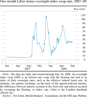 The elevated risk spreads, high volatility, and impaired functioning that characterized domestic and international financial markets in the second half of 2007 continued through the first half of 2008. Spillovers from the slumping U.S. housing market were the largest direct source of these pressures, but a generalized flight from riskier assets--particularly structured credit products--and worries about a global economic slowdown also contributed to financial strains.9 The Federal Reserve lowered the target federal funds rate an additional 225 basis points over the first four months of 2008 in response to a deteriorating outlook for economic activity.Financial strains increased significantly during the first quarter, leading to a liquidity crisis in March at The Bear Stearns Companies, Inc., a major investment bank, and to its subsequent acquisition by JPMorgan Chase & Co. Additional actions taken by the Federal Reserve to improve market functioning and liquidity, including the introduction of liquidity facilities for primary dealers, appeared to have an ameliorative effect, and tensions eased somewhat in the second quarter. (See the box entitled "The Federal Reserve's Liquidity Operations".) Nevertheless, conditions in a broad range of domestic and international financial markets remained strained relative to previous years. This week, the Board of Governors announced a temporary arrangement that allows the Federal Reserve to extend credit to Fannie Mae and Freddie Mac, if necessary.