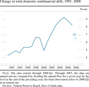 The total debt of the domestic nonfinancial sector expanded at an annual rate of 6-1/2 percent in the first quarter of 2008, a somewhat slower pace than in 2007. The moderation in borrowing was mainly accounted for by a slowdown in the growth of household debt, particularly mortgage debt. Borrowing by nonfinancial businesses also decelerated, but at a 9-1/4 percent pace, it was still high by historical standards. Preliminary data suggest that overall debt growth slowed further in the second quarter.