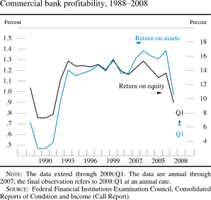 The overall delinquency rate on loans held by commercial banks rose in the first quarter to its highest level since the early 1990s, and the charge-off rate increased to the upper end of its range since 2000. The deterioration in credit quality was accounted for primarily by continued erosion in the performance of residential mortgages and a considerable worsening in construction and land development loans, but performance of most other types of loans also weakened. To bolster equity positions diminished by asset write-downs and loan-loss provisions, commercial banks raised a substantial volume of capital in the first half of 2008; some banks reduced dividends to further shore up their capital.