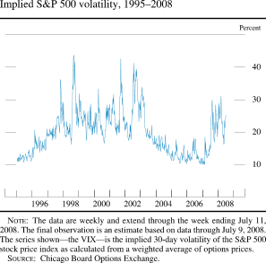 Actual and implied volatilities of broad equity price indexes shot up last year with the onset of financial strains. The partial easing of financial strains in the second quarter was associated with modest declines in the actual and implied volatilities of equity prices to levels still above those of the past few years. The 12-month-forward expected earnings-price ratio for S&P 500 firms jumped in the first half of 2008, while the long-term real Treasury yield rose only slightly. The difference between these two values--a rough measure of the premium that investors require for holding equity shares--has reached the high end of its range over the past 20 years.
