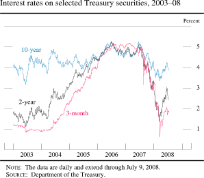 Treasury yields fell sharply from the end of 2007 through March amid concerns about the health of financial firms, severe strains in financial markets, a weakening economic outlook, and lower expectations for future policy rates. Since late March, yields have risen across the curve as fears of a deep economic contraction have receded and concerns about the inflation outlook have increased. On net, 2-year yields are down 65 basis points, and 10-year yields are down 20 basis points since the start of the year.