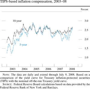 Yields on Treasury inflation-protected securities largely moved in line with nominal yields--that is, they fell through mid-March and then rose--but the rise since March has been somewhat less than that of nominal yields. In addition, shifting liquidity conditions in the markets for nominal and indexed Treasury securities at times affected the spreads between nominal and indexed yields, also known as inflation compensation. On net, 10-year inflation compensation has risen about 20 basis points since the end of 2007, suggesting some increase in investors' concerns about the inflation outlook. Inflation compensation rose over both the near term and the longer term, but the increase was larger over the near term, as compensation over the next 5 years rose about 30 basis points whereas compensation over the period from 5 years ahead to 10 years ahead rose only 10 basis points. In part because of a lag in the indexation of inflation-protected securities, near-term inflation compensation can be strongly affected by the latest movements in energy and food prices; these prices have risen sharply in recent months.