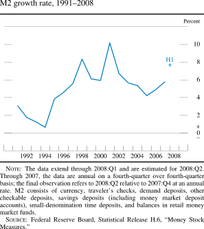 M2 is estimated to have expanded at an annual rate of 7-3/4 percent over the first half of 2008, notably faster than the likely growth rate of nominal GDP. Demand for money balances was supported by declines in the opportunity cost of holding money relative to other financial assets and by strong demand for safe and liquid assets amid volatility and strains in financial markets. Money market mutual fund shares grew particularly rapidly in the first quarter. However, growth of money market mutual funds dropped considerably in the second quarter, and small time deposits contracted; M2 slowed accordingly. Demand for currency continued to be lackluster for the most of the first half-year, but it picked up noticeably late in the second quarter as domestic demand grew and foreign demand was estimated to be less weak.