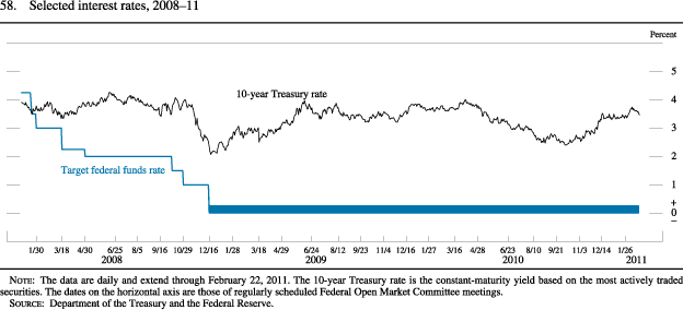 The Federal Open Market Committee (FOMC) maintained a target range for the federal funds rate of 0 to 1/4 percent throughout the second half of 2010 and into 2011 (figure 58). In the statement accompanying each regularly scheduled FOMC meeting, the Committee noted that economic conditions, including low rates of resource utilization, subdued inflation trends, and stable inflation expectations, were likely to warrant exceptionally low levels of the federal funds rate for an extended period. With the unemployment rate elevated and measures of underlying inflation somewhat low relative to levels that the Committee judged to be consistent, over the long run, with its dual mandate of maximum employment and price stability, the FOMC took steps during the second half of 2010 to provide additional monetary accommodation in order to promote a stronger pace of economic recovery and to help ensure that inflation, over time, returns to levels consistent with its mandate. In August, the FOMC announced that it would keep constant the Federal Reserve's holdings of longer-term securities at their then-current level by reinvesting principal payments from agency debt and agency mortgage-backed securities (MBS) in longer-term Treasury securities. Then, in November, the FOMC announced that it intended to purchase an additional $600 billion of longer-term Treasury securities by the end of the second quarter of 2011. The Committee noted that it would regularly review the pace of its securities purchases and the overall size of the asset purchase program in light of incoming information.