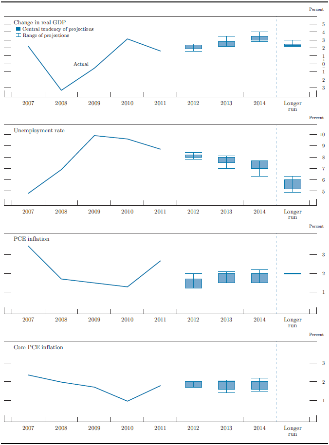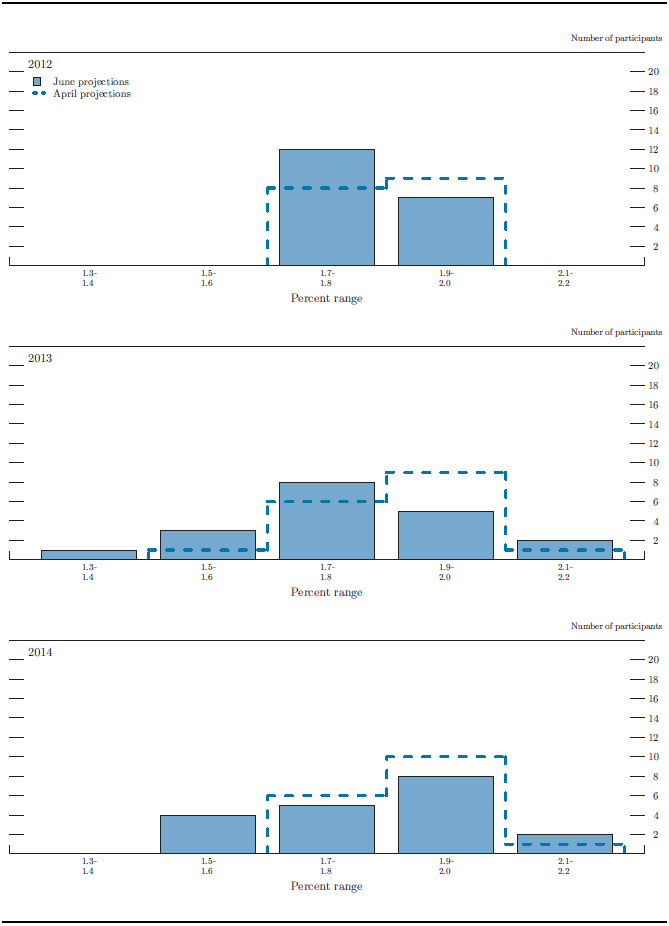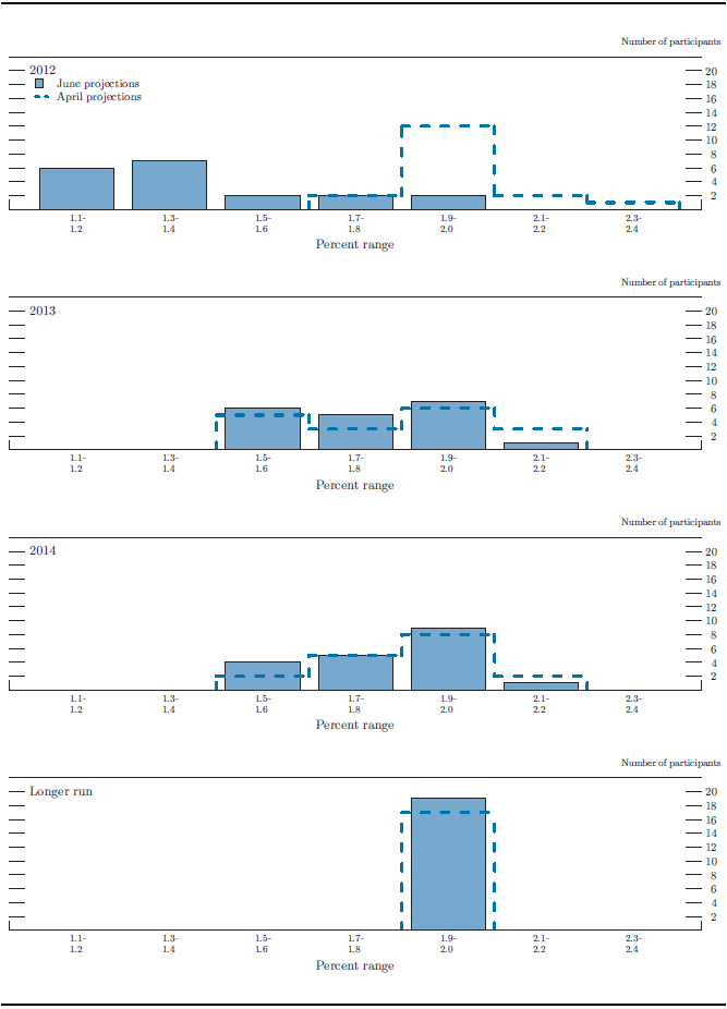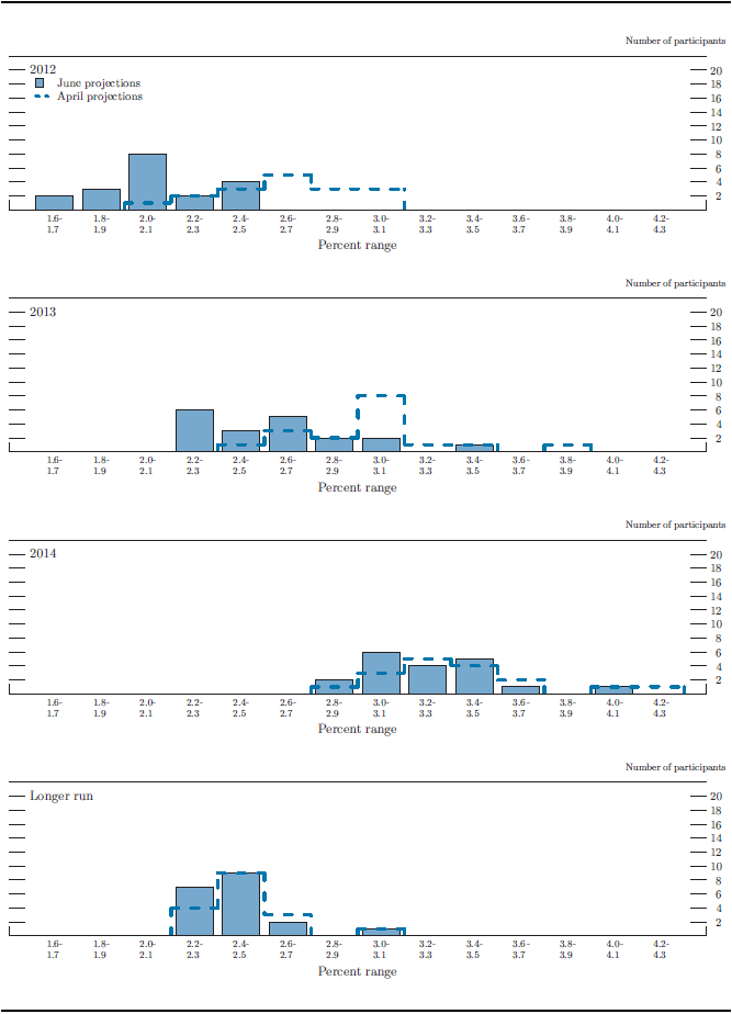 Overall, the assessments that FOMC participants submitted in June indicated that, under appropriate monetary policy, the pace of economic expansion over the 2012-14 period would likely continue to be moderate and inflation would remain subdued (see table 1 and figure 1). Participants judged that the growth rate of real gross domestic product (GDP) would pick up gradually and that the unemployment rate would edge down very slowly. Participants projected that inflation, as measured by the annual change in the price index for personal consumption expenditures (PCE), would run close to or below the FOMC's longer-run inflation objective of 2 percent.