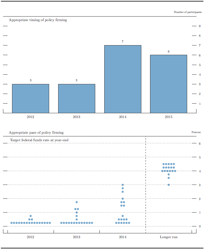 *NOTE: In the upper panel, the height of each bar denotes the number of FOMC participants who judge that, under appropriate monetary policy, the first increase in the target federal funds rate from its current range of 0 to 1/4 percent will occur in the specified calendar year. In April 2012, the numbers of FOMC participants who judged that the first increase in the target federal funds rate would occur in 2012, 2013, 2014, and 2015 were, respectively, 3, 3, 7, and 4. In the lower panel, each shaded circle indicates the value (rounded to the nearest 1/4 percentage point) of an individual participant’s judgment of the appropriate level of the target federal funds rate at the end of the specified calendar year or over the longer run.
