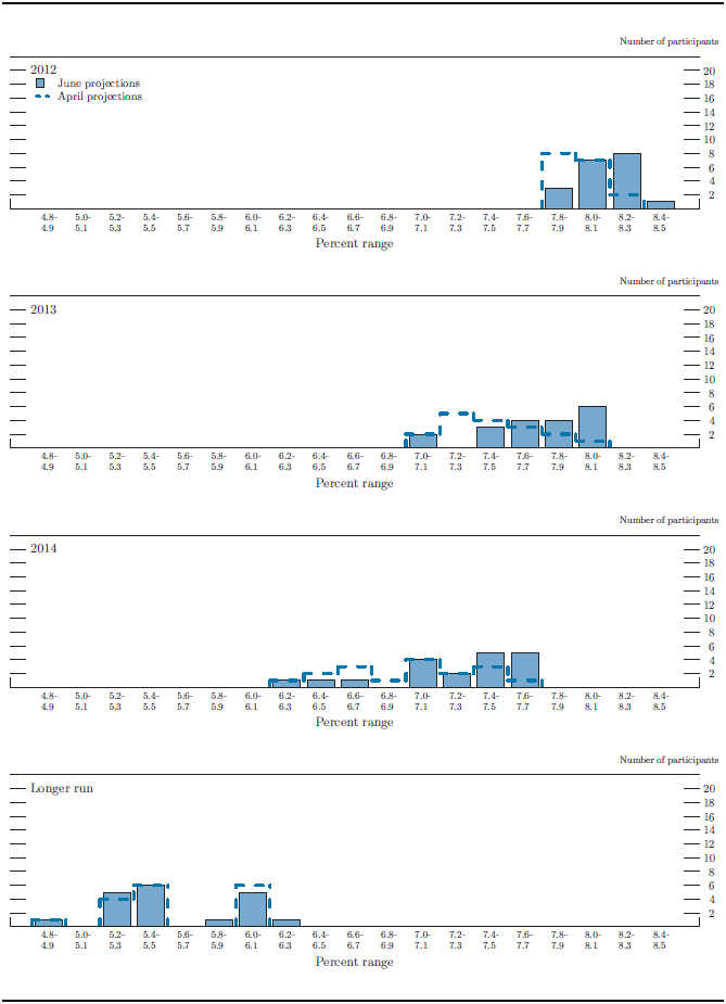 Conditional upon their individual assumptions about appropriate monetary policy, participants judged that the economy would continue to expand at a moderate pace in 2012 and 2013 before picking up in 2014 to a pace somewhat above what participants view as the longer-run rate of output growth. The central tendency of their projections for the change in real GDP in 2012 was 1.9 to 2.4 percent, lower than in April. Many participants characterized the incoming data--especially for household spending and the labor market--as having been weaker than they had anticipated in April. In addition, most noted that the worsening situation in Europe was leading to a slowdown in global economic growth and greater volatility in financial markets. Compared with their April submissions, most participants lowered their medium-run projections of economic activity somewhat. The central tendencies of participants' projections of real economic growth in 2013 and 2014 were 2.2 to 2.8 percent and 3.0 to 3.5 percent, respectively. The central tendency for the longer-run rate of increase of real GDP was 2.3 to 2.5 percent, little changed from April. Participants cited several headwinds that were likely to hold back the pace of economic expansion over the forecast period, including the difficult fiscal and financial situation in Europe, a still-depressed housing market, tight credit for some borrowers, and fiscal restraint in the United States.Consistent with the downward revisions to their projections for real GDP growth in 2012 and 2013, nearly all participants marked up their assessments for the rate of unemployment. Participants projected the unemployment rate at the end of 2012 to remain at or slightly below recent levels, with a central tendency of 8.0 to 8.2 percent, somewhat higher than their April submissions. Participants anticipated gradual improvement in labor market conditions by 2014, but even so, they generally thought that the unemployment rate at the end of that year would still lie well above their individual estimates of its longer-run normal level. The central tendencies of participants' forecasts for the unemployment rate were 7.5 to 8.0 percent at the end of 2013 and 7.0 to 7.7 percent at the end of 2014. The central tendency of participants' estimates of the longer-run normal rate of unemployment that would prevail under the assumption of appropriate monetary policy and in the absence of further shocks to the economy was 5.2 to 6.0 percent, unchanged from April. Most participants projected that the gap between the current unemployment rate and their estimates of its longer-run normal rate would be closed in five or six years, a couple judged that less time would be needed, and one thought more time would be necessary because of the persistent headwinds impeding the economic expansion.