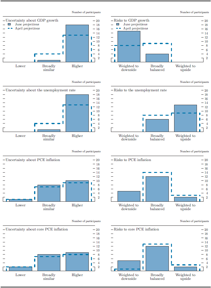 Overall, participants judged the uncertainty associated with the outlook for real activity and the unemployment rate to be unusually high relative to historical norms, with the risks weighted mainly toward slower economic growth and a higher unemployment rate. Many participants also viewed the uncertainty surrounding their projections for inflation to be greater than normal, but most saw the risks to inflation to be broadly balanced.
