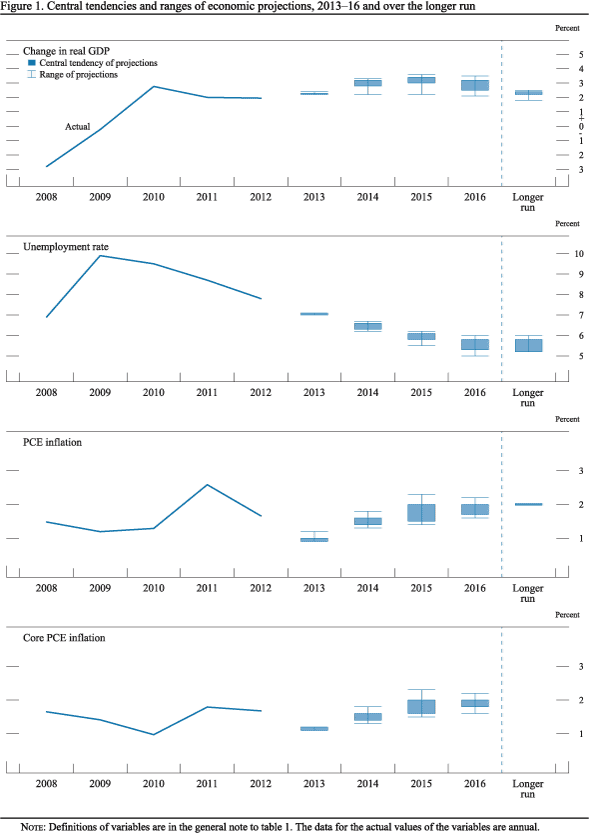 Overall, FOMC participants expected, under appropriate monetary policy, that economic growth would pick up, on average, over the next three years, with the unemployment rate declining gradually (table 1 and figure 1). Almost all of the participants projected that inflation, as measured by the annual change in the price index for personal consumption expenditures (PCE), would rise to a level at or slightly below the Committee's 2 percent objective in 2016.