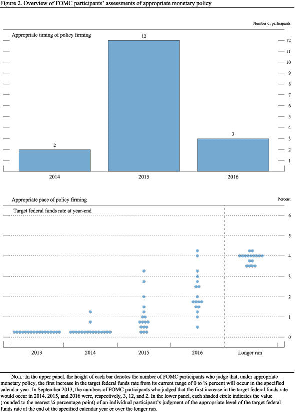 As in September, all of the participants who saw the first tightening in either 2015 or 2016 judged that the appropriate level of the federal funds rate at the end of 2016 would still be below their individual assessments of its expected longer-run value. In contrast, the two participants who saw the first tightening in 2014 believed that the appropriate level of the federal funds rate at the end of 2016 would be at their assessment of its longer-run level, which they judged to be either at or just above 4 percent. Among all participants, estimates of the longer-run target federal funds rate ranged from 3-1/2 to about 4-1/4 percent, reflecting the Committee's inflation objective of 2 percent and participants' individual judgments about the appropriate longer-run level of the real federal funds rate in the absence of further shocks to the economy.