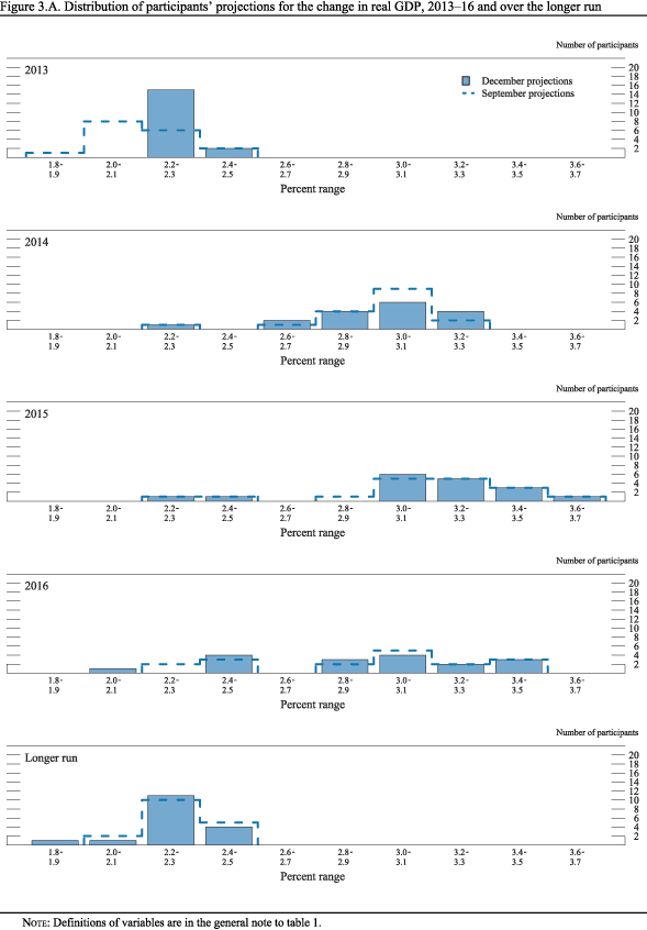 Participants generally projected that, conditional on their individual assumptions about appropriate monetary policy, real GDP growth would accelerate in 2014 from its rate in 2013 and would pick up further in 2015. Subsequently, in 2016, real GDP growth would begin to converge back to a pace that participants saw as the longer-run rate of output growth. Participants pointed to a number of factors contributing to the pickup in growth in the near term, including diminishing restraint from fiscal policy, pent-up demand for consumer and producer durables, rising household net worth, stronger growth abroad, and accommodative monetary policy. A number of participants noted that growth in residential investment had slowed some recently as a result of higher mortgage rates, but they expected growth to strengthen beginning in 2014. Several participants also noted a slowdown in the growth of business investment but saw growth picking up over the forecast horizon, reflecting an expected acceleration in sales.The central tendencies of participants' projections for real GDP growth were 2.2 to 2.3 percent in 2013, 2.8 to 3.2 percent in 2014, 3.0 to 3.4 percent in 2015, and 2.5 to 3.2 percent in 2016. The central tendency for the longer-run rate of growth of real GDP was 2.2 to 2.4 percent. These projections were little changed from September.