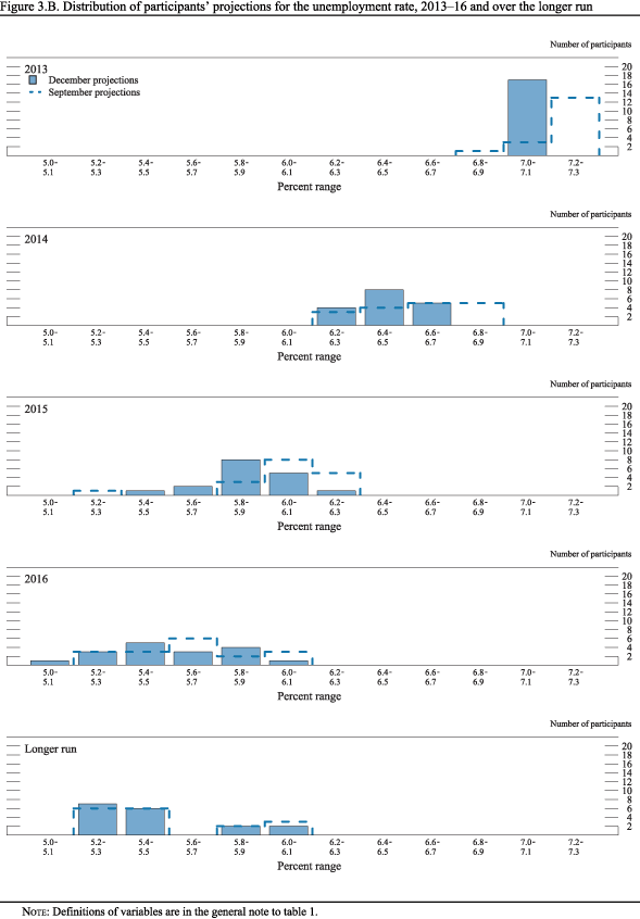 Figures 3.A and 3.B show that participants' views regarding the likely outcomes for real GDP growth and the unemployment rate remained dispersed. The diversity evidently reflected their individual assessments of the likely rate at which the restraint from fiscal policy will diminish and demand for consumer and producer durables will recover, the anticipated path for foreign economic activity, the trajectory for growth in household net worth, and the appropriate path of monetary policy. Relative to September, the dispersions of participants' projections for GDP growth in 2014 and beyond were about unchanged, while dispersions of the projections for the unemployment rate narrowed some through 2015.