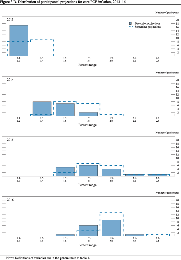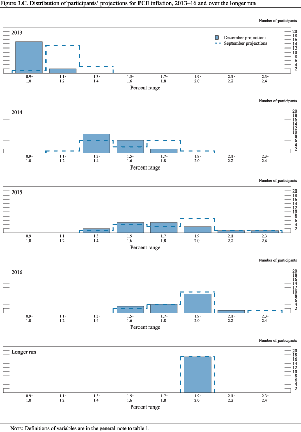Participants' views on the broad outlook for inflation under the assumption of appropriate monetary policy were marked down a bit in 2013 and 2014 from those in their September projections, but the central tendencies for 2015 and beyond were similar. All participants anticipated that, on average, both headline and core inflation would rise gradually over the next few years, and a large majority of participants expected headline inflation to be at or slightly below the Committee's 2 percent objective in 2016. Specifically, the central tendencies for PCE inflation were 0.9 to 1.0 percent in 2013, 1.4 to 1.6 percent in 2014, 1.5 to 2.0 percent in 2015, and 1.7 to 2.0 percent in 2016. The central tendencies of the forecasts for core inflation were slightly lower over the projection period than in September and broadly similar to those for the headline measure. A number of participants viewed the combination of stable inflation expectations and diminishing resource slack as likely to contribute to a gradual rise of inflation back toward the Committee's longer-run objective.Figures 3.C and 3.D provide information on the diversity of participants' views about the outlook for inflation. Relative to September, the ranges of participants' projections for overall inflation narrowed some in 2013 and 2014 but remained relatively unchanged thereafter. In 2016, the forecasts for PCE inflation were concentrated near the Committee's longer-run objective, though one participant expected inflation to be 1/4 percentage point above the Committee's objective and another three expected it to be almost 1/2 percentage point below. Similar to the projections for headline inflation, the projections for core inflation also were concentrated near 2 percent in 2016.