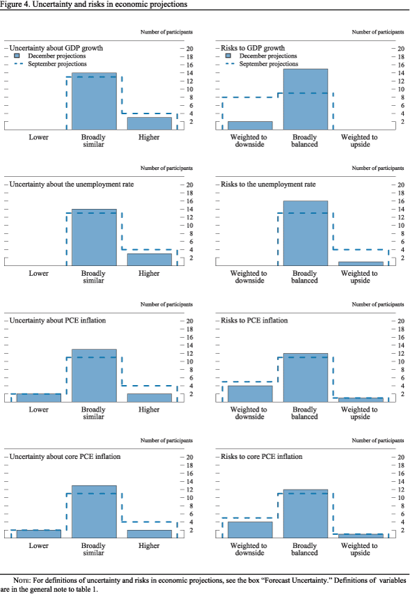 Nearly all participants judged that the levels of uncertainty about their projections for real GDP growth and unemployment were broadly similar to the norm during the previous 20 years, although three participants continued to see them as higher (figure 4). 1 More participants than in September judged the risks to real GDP growth and the unemployment rate to be broadly balanced. A range of factors was cited as contributing to this change in view, including an improved outlook for global financial and economic conditions, a moderation in geopolitical risks, an upgraded assessment of the prospects for consumption growth, and reduced odds of a fiscal impasse.