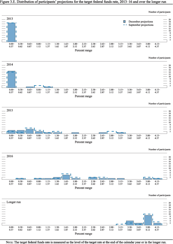 Figure 3.E provides the distribution of participants' judgments regarding the appropriate level of the target federal funds rate at the end of each calendar year from 2013 to 2016 and over the longer run. As noted above, most participants judged that economic conditions would warrant maintaining the current low level of the federal funds rate until 2015. The two participants who saw the federal funds rate leaving the effective lower bound earlier submitted projections for the federal funds rate at the end of 2014 of 3/4 percent and 1-1/4 percent. These two participants' views of the appropriate level of the federal funds rate at the end of 2015 were 2-3/4 percent and 3-1/4 percent, while the remainder of participants saw the appropriate level of the funds rate at that time to be 2 percent or lower. On balance, while the dispersion of projections for the value of the federal funds rate in each year changed little since September, the median value of the rate at the end of 2015 and 2016 decreased 1/4 percentage point.