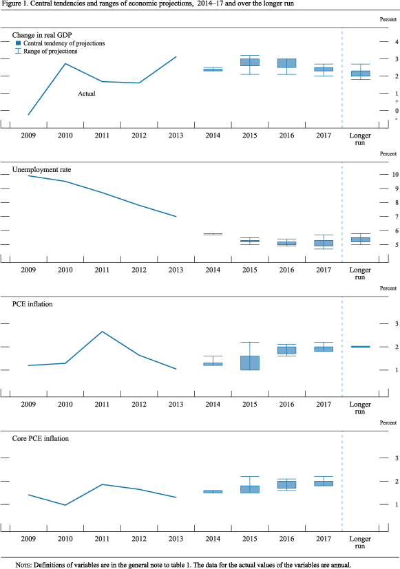 Overall, FOMC participants expected that, after a slowdown in the first half of 2014, economic growth under appropriate policy would be faster in the second half of 2014 and over 2015 and 2016 than their estimates of the U.S. economy's longer-run normal growth rate. On balance, participants then saw economic growth moving back toward their assessments of its longer-run pace in 2017 (table 1 and figure 1). Most participants projected that the unemployment rate will continue to decline in 2015 and 2016, and all participants projected that the unemployment rate will be at or below their individual judgments of its longer-run normal level by the end of 2016. All participants projected that inflation, as measured by the four-quarter change in the price index for personal consumption expenditures (PCE), would rise gradually, on balance, over the next few years. Most participants saw inflation approaching the Committee's 2 percent longer-run objective in 2016 and 2017. While a few participants projected that inflation would rise temporarily above 2 percent during the forecast period, many others expected inflation to remain low through 2017.