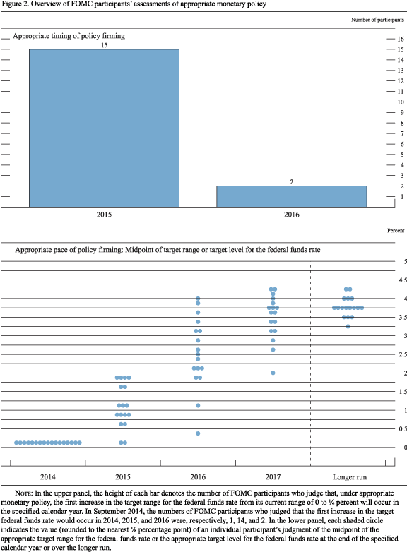 10. As discussed in its Policy Normalization Principles and Plans, released on September 17, 2014, the Committee intends to target a range for the federal funds rate during normalization.Participants were asked to provide, in their contributions to the Summary of Economic Projections, either the midpoint of the target range for the federal funds rate for any period when a range was anticipated or the target level for the federal funds rate, as appropriate.In the lower panel of figure 2, these values have been rounded to the nearest 1/8 percentage point. Return to text