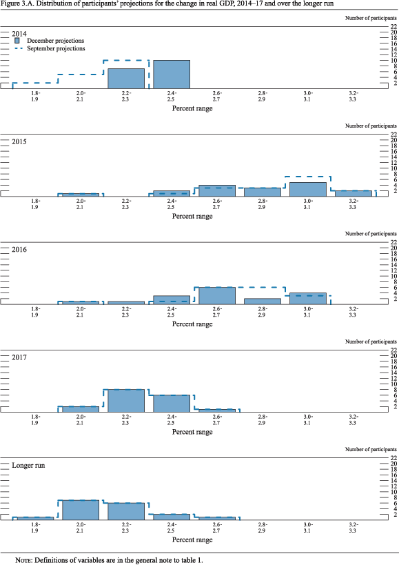 Participants projected that, conditional on their individual assumptions about appropriate monetary policy, growth in real gross domestic product (GDP) would pick up from its low level in the first half of 2014 and run above their estimates of its longer-run normal rate in the second half of 2014 and over 2015 and 2016. Participants pointed to a number of factors that they expected would contribute to stronger real output growth, including improving labor market conditions, lower energy prices, rising household net worth, diminishing restraint from fiscal policy, and highly accommodative monetary policy. On balance, participants saw real GDP growth moving back toward, but remaining at or somewhat above, its longer-run rate in 2017 as monetary policy adjusts appropriately.In general, participants' revisions to their forecasts for real GDP growth relative to their projections for the September meeting were modest. However, all participants revised up their projections of real GDP growth somewhat for 2014, with a number of them noting that recent data releases regarding real economic activity had been stronger than anticipated. The central tendencies of participants' current projections for real GDP growth were 2.3 to 2.4 percent in 2014, 2.6 to 3.0 percent in 2015, 2.5 to 3.0 percent in 2016, and 2.3 to 2.5 percent in 2017. The central tendency of the projections of real GDP growth over the longer run was 2.0 to 2.3 percent, unchanged from September.