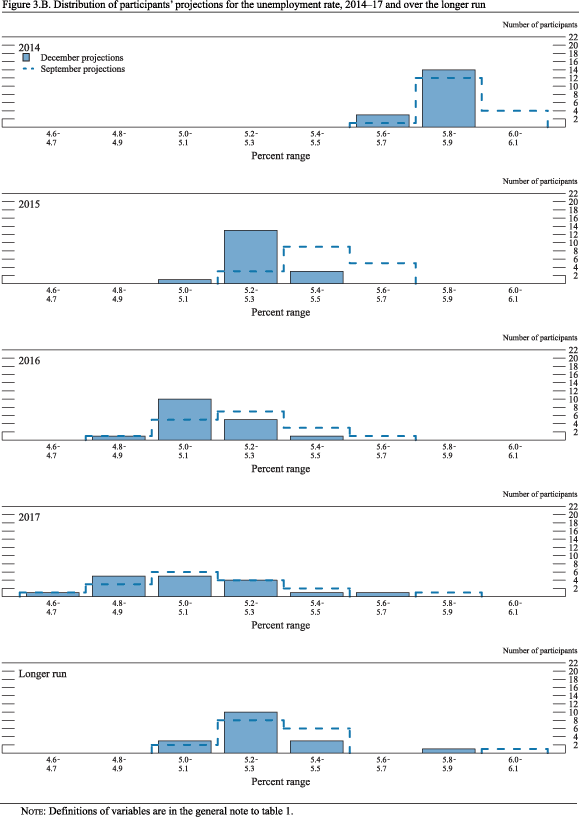 All participants projected that the unemployment rate will decline, on balance, through 2016, and all participants projected that, by the end of that year, the unemployment rate will be at or below their individual judgments of its longer-run normal level. The central tendencies of participants' forecasts for the unemployment rate in the fourth quarter of each year were 5.8 percent in 2014, 5.2 to 5.3 percent in 2015, 5.0 to 5.2 percent in 2016, and 4.9 to 5.3 percent in 2017. Almost all participants' projected paths for the unemployment rate shifted down slightly through 2015 compared with their projections in September; many participants noted that recent data pointing to improving labor market conditions were an important factor underlying the downward revisions in their unemployment rate forecasts. The central tendency of participants' estimates of the longer-run normal rate of unemployment that would prevail under appropriate monetary policy and in the absence of further shocks to the economy was unchanged at 5.2 to 5.5 percent; the range of these estimates was 5.0 to 5.8 percent, down slightly from 5.0 to 6.0 percent in September.