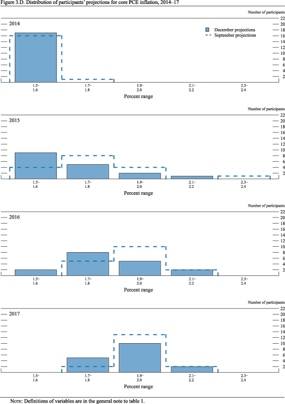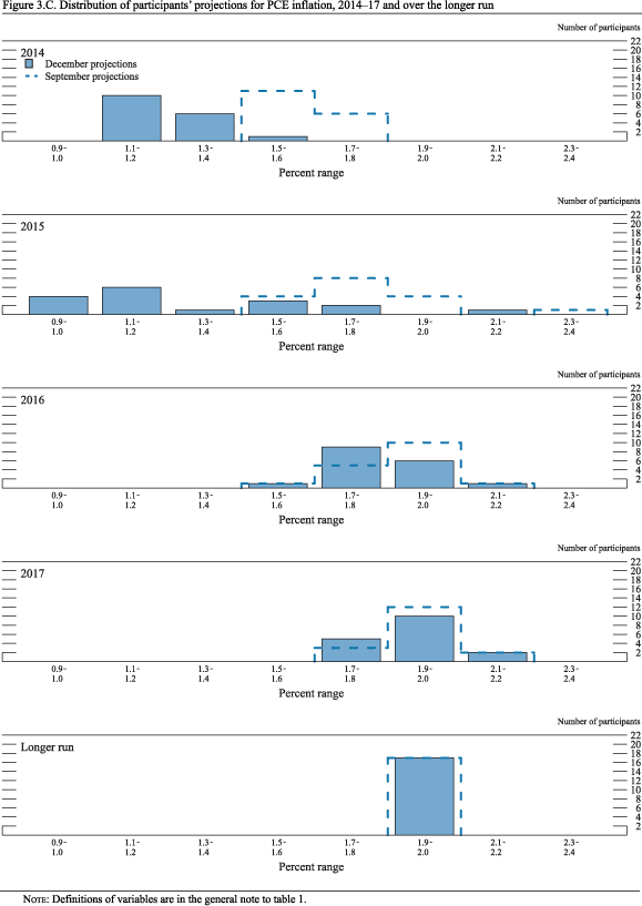 Compared with September, the central tendencies of participants' projections for PCE inflation under the assumption of appropriate monetary policy moved down for 2014 and 2015 but were largely unchanged for 2016 and 2017. In commenting on the changes to their projections, many participants indicated that the significant decline in energy prices and the appreciation of the dollar since the Committee's September meeting likely will put temporary downward pressure on inflation. The central tendencies of participants' projections for core PCE inflation moved down somewhat for 2015 but were mostly unchanged in other years. Almost all participants projected that PCE inflation would rise gradually, on balance, over the period from 2015 to 2017, reaching a level at or near the Committee's 2 percent objective. A few participants expected PCE inflation to rise slightly above 2 percent at some point during the forecast period, while many others expected inflation to remain below 2 percent for the entire period. The central tendencies for PCE inflation were 1.2 to 1.3 percent in 2014, 1.0 to 1.6 percent in 2015, 1.7 to 2.0 percent in 2016, and 1.8 to 2.0 percent in 2017. The central tendencies of the forecasts for core inflation were higher than those for the headline measure in 2014 and 2015, reflecting the effects of lower oil prices. The central tendencies of the two measures were equal in 2016 and in 2017. Factors cited by participants as likely to contribute to a gradual rise of inflation toward the Committee's longer-run objective of 2 percent included stable longer-term inflation expectations, steadily diminishing resource slack, a pickup in wage growth, waning effects of declines in oil prices, and still-accommodative monetary policy.Figures 3.C and 3.D provide information on the diversity of participants' views about the outlook for inflation. In addition to moving lower, the range of participants' projections for PCE inflation in 2015 widened somewhat relative to September, likely reflecting in part differences in participants' assessments of the effects of the recent decline in energy prices on the outlook for inflation. The ranges for core inflation narrowed in 2014 and 2015. In other years of the projection, the ranges of the inflation projections were relatively little changed. The range for both measures in 2017 continued to show a very substantial concentration near the Committee's 2 percent longer-run objective by that time.