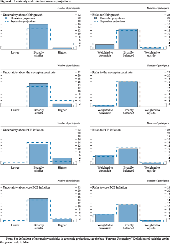 Nearly all participants continued to judge the levels of uncertainty attending their projections for real GDP growth and the unemployment rate as broadly similar to the norms during the previous 20 years figure 4. 11 Most participants continued to see the risks to their outlooks for real GDP growth as broadly balanced. A few participants viewed the risks to real GDP growth as weighted to the downside; one viewed the risks as weighted to the upside. Those participants who viewed the risks as weighted to the downside cited, for example, concern about the limited ability of monetary policy at the effective lower bound to respond to further negative shocks to the economy or about the trajectory for economic growth abroad. As in September, nearly all participants judged the risks to the outlook for the unemployment rate to be broadly balanced.