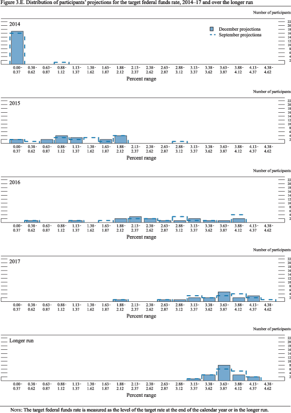Figure 3.E provides the distribution of participants' judgments regarding the appropriate level of the target federal funds rate, conditional on their assessments of the economic outlook, at the end of each calendar year from 2014 to 2017 and over the longer run. All participants judged that economic conditions would warrant maintaining the current exceptionally low level of the federal funds rate into 2015. The median values of the federal funds rate at the end of 2015 and 2016 fell 25 basis points and 38 basis points relative to September, to 1.13 percent and 2.50 percent, respectively, while the mean values fell 15 basis points for both years, to 1.13 percent in 2015 and 2.54 percent in 2016. The dispersion of the projections for the appropriate level of the federal funds rate was narrower in 2014 and 2015 and was little changed in 2016 and 2017. Most participants judged that it would be appropriate to set the federal funds rate at or near its longer-run normal level in 2017, although a number of them projected that the federal funds rate would still need to be set appreciably below its longer-run normal level at that time and one anticipated that it would be appropriate to target a level noticeably above its longer-run normal level. Participants provided a number of reasons why they thought it would be appropriate for the federal funds rate to remain below its longer-run normal level for some time after inflation and the unemployment rate were near mandate-consistent levels. These reasons included an assessment that the headwinds that have been holding back the recovery will continue to exert some restraint on economic activity at that time, that residual slack in the labor market will still be evident in other measures of labor utilization, and that the risks to the economic outlook are asymmetric as a result of the constraints on monetary policy associated with the effective lower bound on the federal funds rate.