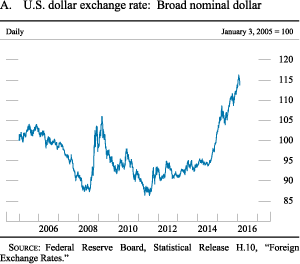 The broad dollar has appreciated more than 20 percent since the middle of 2014, reflecting both heightened concerns about the global outlook, which have resulted in safe-haven flows toward dollar assets, and diverging expectations regarding domestic and foreign monetary policy (Figure A). A stronger dollar makes foreign goods cheaper for U.S. consumers. An extensive literature, however, has found that the pass-through of exchange rate changes to U.S. import prices is incomplete--that is, less than proportionate--as foreign exporters prefer to absorb part of the exchange rate change by narrowing profit margins. For example, a typical estimate is that a 10 percent appreciation of the dollar causes the prices of non-oil imported goods to decline about 3 percent after one year. 1 Roughly one-third of this effect occurs through the effect on imported commodities, as an increase in the value of the dollar tends to lower commodity prices proportionately.