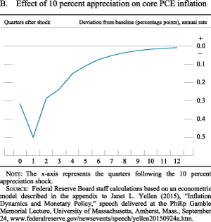 Because imported goods and services make up only a modest share of U.S. consumption, a given percentage decline in import prices causes a much smaller percentage reduction in core PCE prices. Figure B uses a simple econometric model to illustrate how a 10 percent appreciation of the dollar might affect core PCE inflation through this channel. 2 According to this model, core PCE inflation dips in the two quarters following the appreciation before gradually returning to the baseline, leading to a four-quarter decline in core PCE inflation of about 1/4 percentage point relative to the baseline in the first year following the shock. Given the size of the dollar's appreciation since the middle of 2014, this model suggests that falling import prices depressed core PCE inflation about 1/2 percentage point last year. Although the exact magnitude of the dollar's effect on inflation depends on the specific model used, this exercise suggests that the stronger dollar has played a material role in holding down PCE inflation.